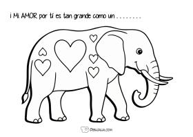 Un dibujo para colorear y regalar en el dia de los enamorados. Postal mi amor es tan grande como un elefante.