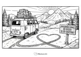 Paisaje con una furgoneta de enamorados con el mensaje cualquier lugar es bueno si es contigo.