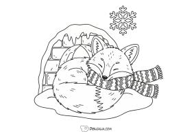 Dibujo para colorear de un zorro durmiendo tranquilo en invierno. Un dibujo de un zorro con estilo cozy.