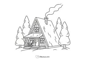 Una cabaña para colorear en el frio invierno con nieve.