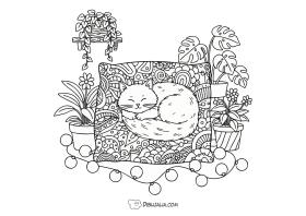 Ilustración para colorear de un gato durmiendo en su cojín muy tranquilo al estilo cozy. Dibujos para colorear para concentrarse y relajarse.